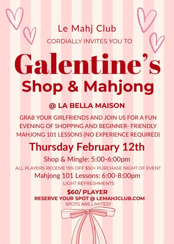 Galentine’s Shop @ Mahjong February 12 @ 5:00 pm - 8:00 pm la bella Maison 20 Milton Ave Alpharetta, GA 30009 United States + Google Map Grab your girlfriends and join us for a fun evening of shopping and beginner-friendly Mahjong 101 lessons. Shop and Mingle: […] Find out more »